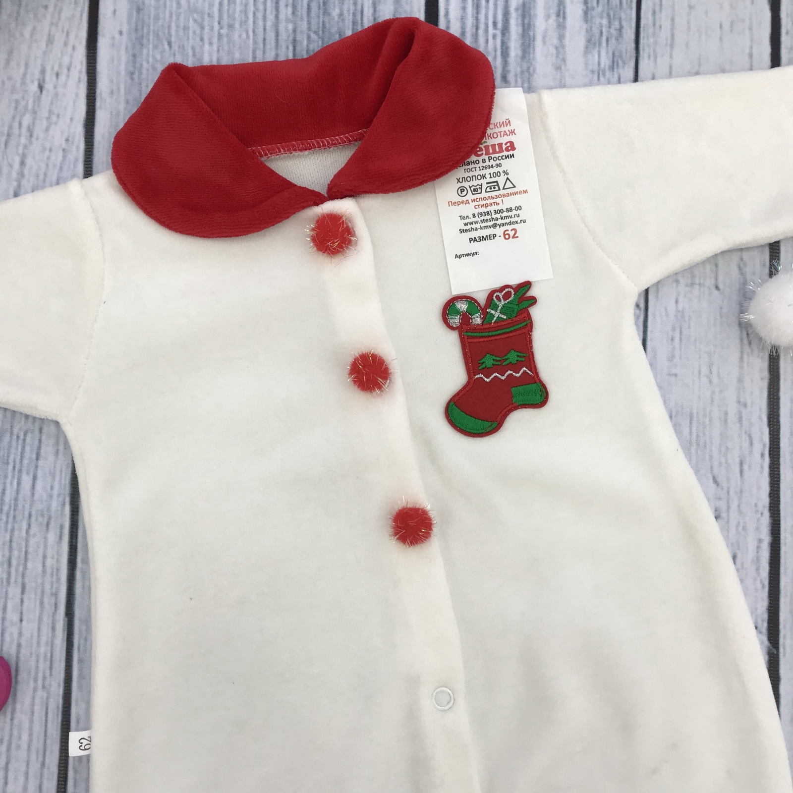 Теги: Купить оптом новогодний комбинезон от производителя. 244. Комбинезон Санта, хлопок 80% велюр 20% ПЭ, молочный 56,62,68 цена,отзывы официальный сайт "Стеша Мурманск"